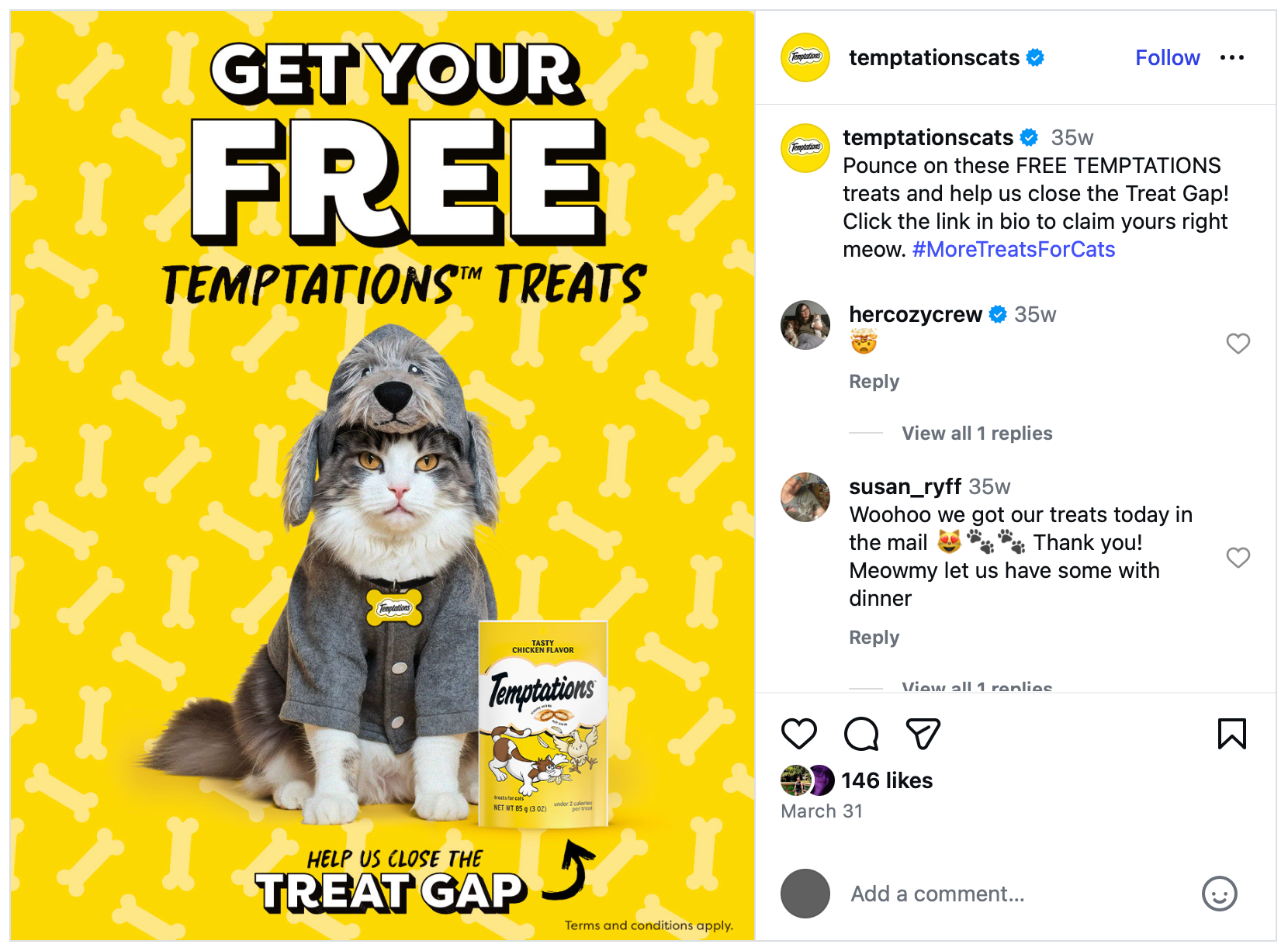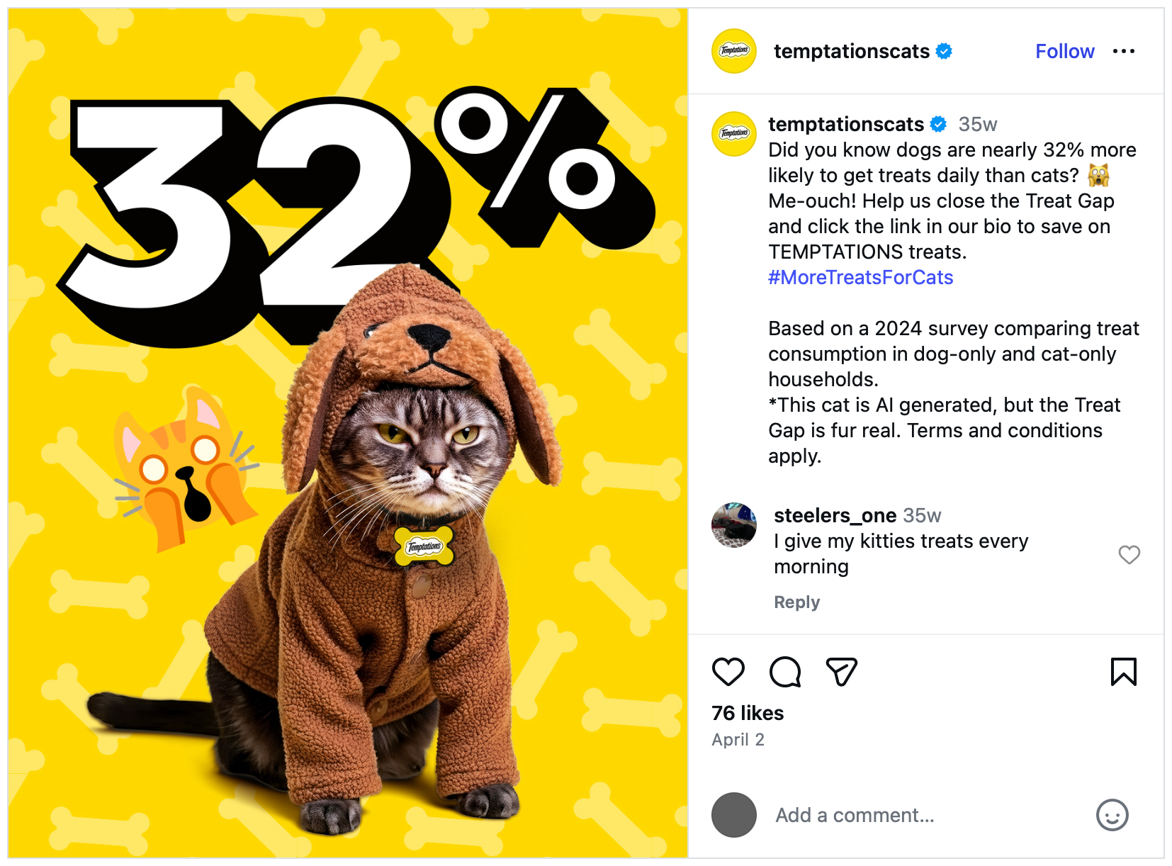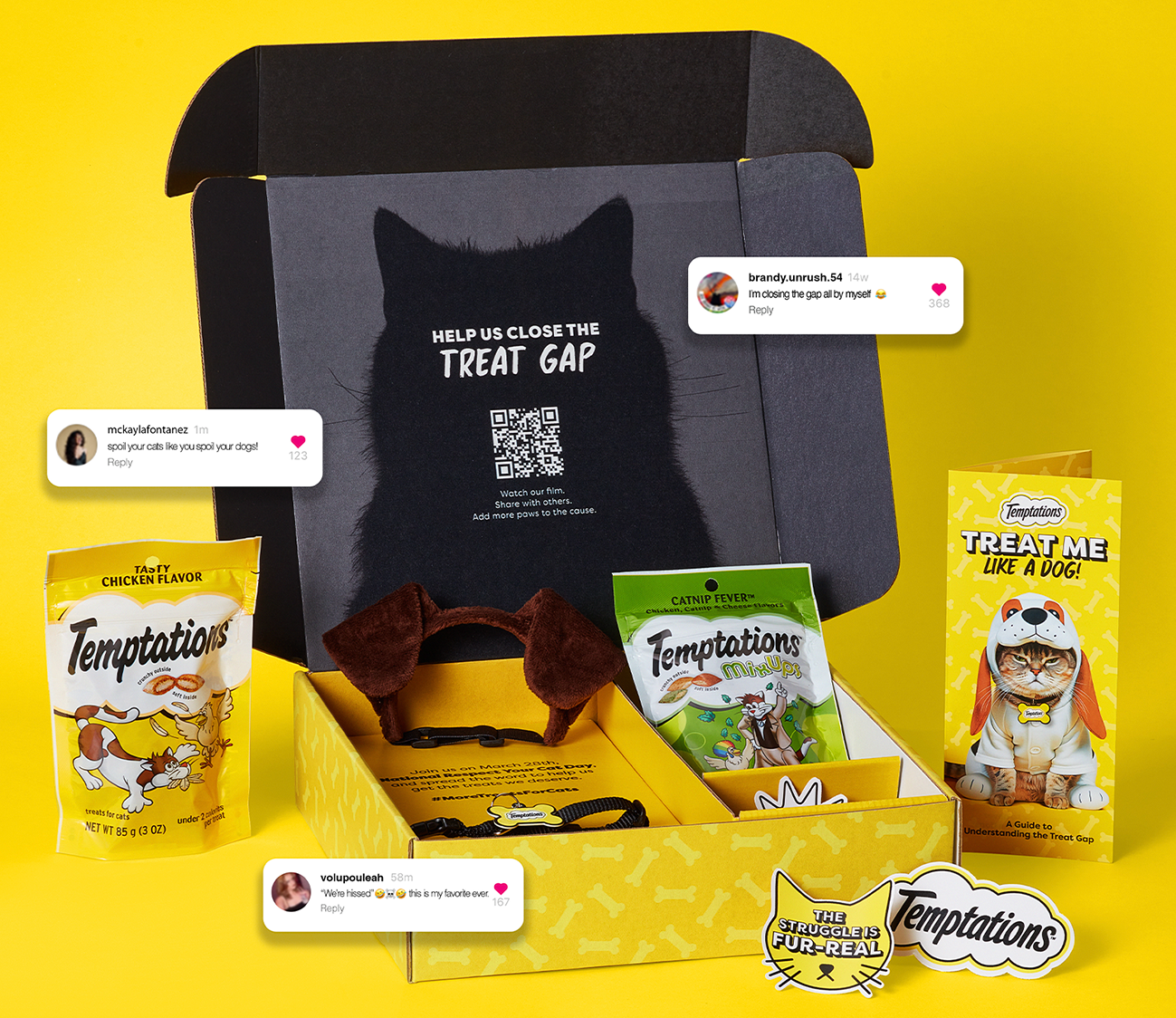 Through pawprietary our team found households that buy both dog and cat food, but ONLY dog treats. We sent these “treat-gappers” custom boxes with Temptations sample packs, infographics educating on the treat gap, and dog costumes so their cats could take part in the campaign through UGC.