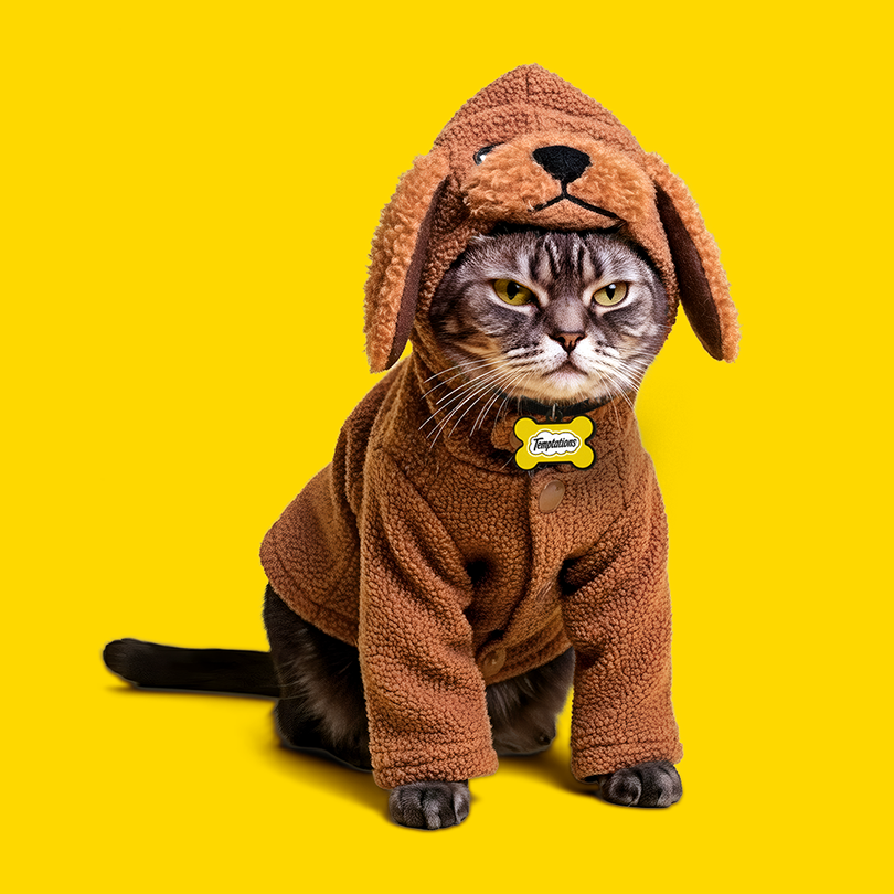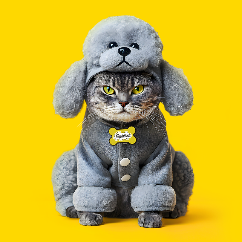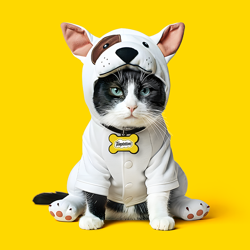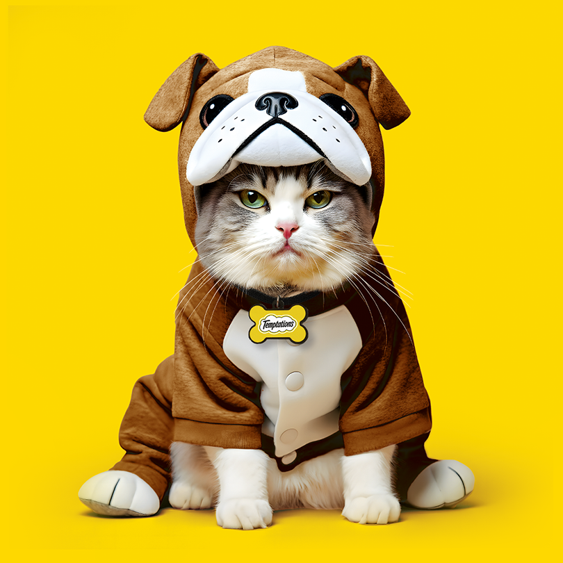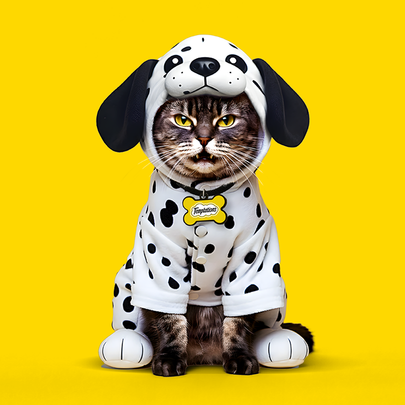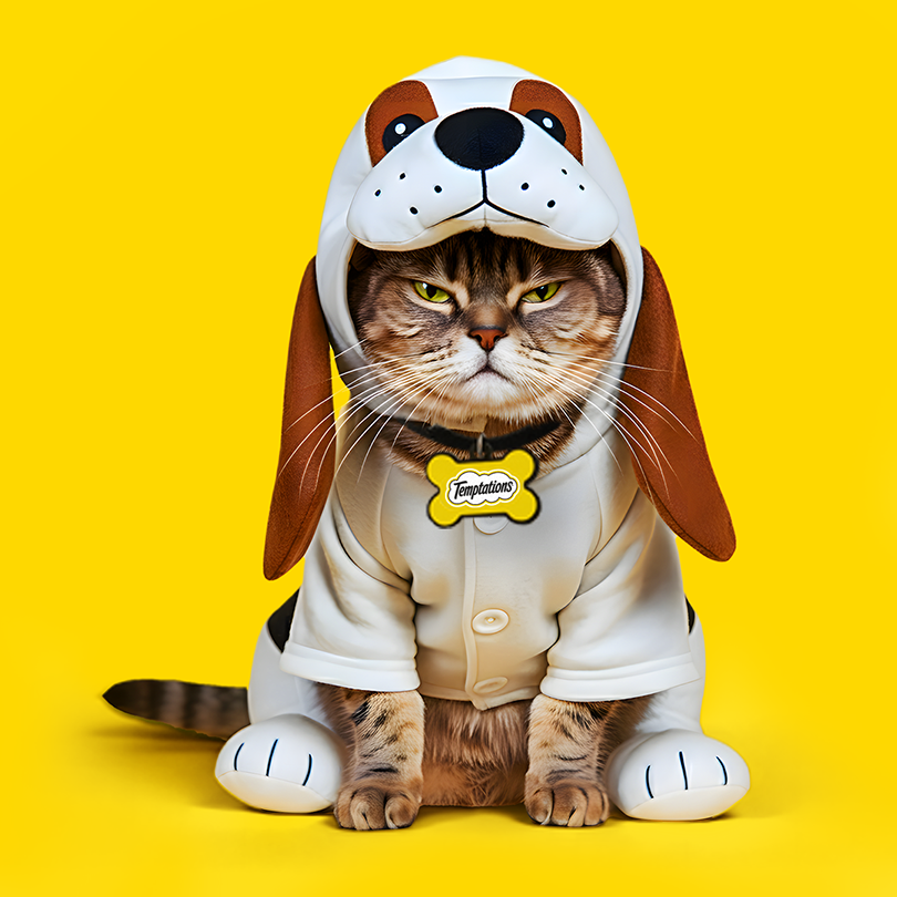 That’s why we partnered with Temptations cat food to create the Treat Me Like A Dog Campaign. On National Respect You Cat Day we kicked off the program to bring awareness to this injustice and get more treats into paws. No felines were disrespected during this production as we harnessed the power of AI to create this crew of barking mad cats, dressed as dogs. They grabbed attention and demand to be “treated” just as often as their dog counterparts.