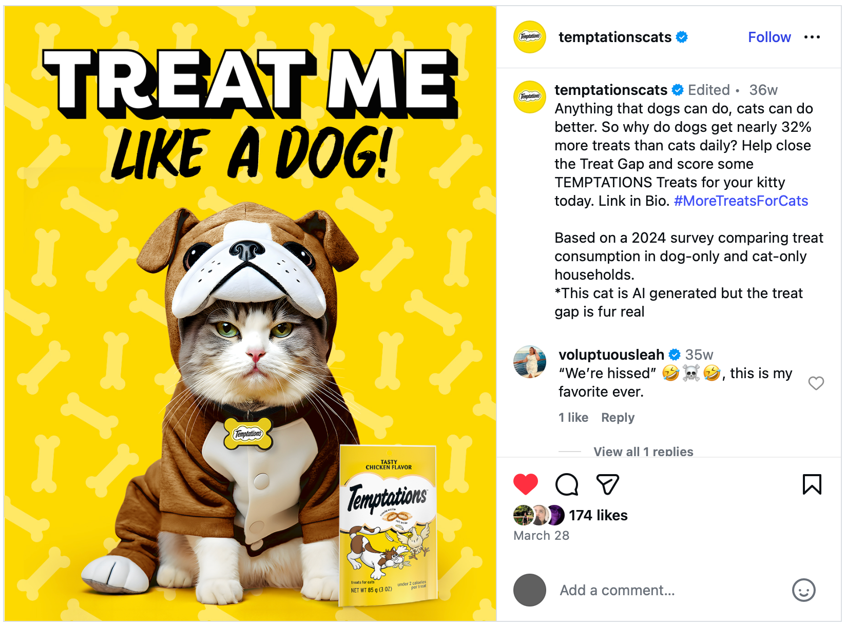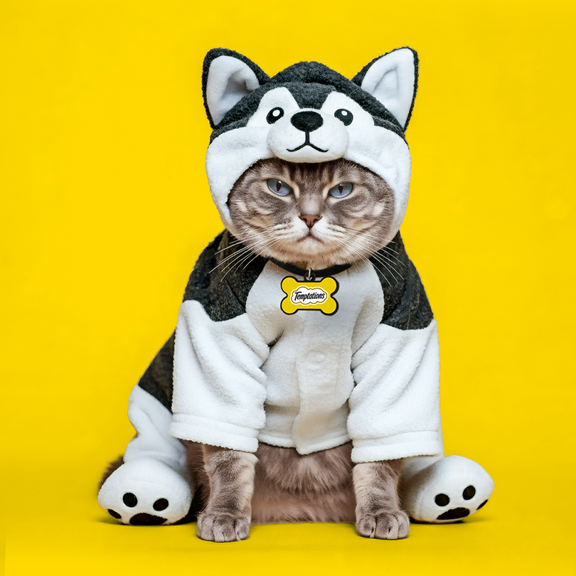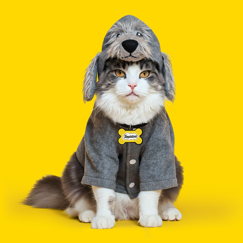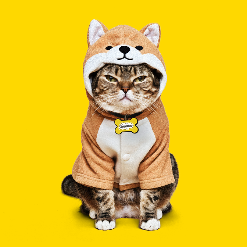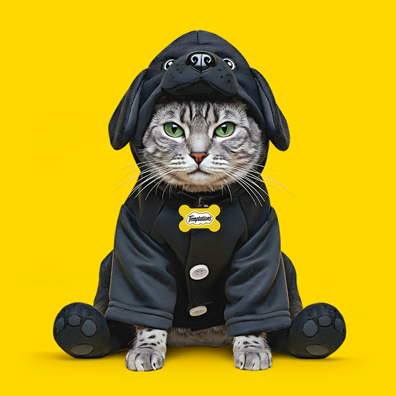 That’s why we partnered with Temptations cat food to create the Treat Me Like A Dog Campaign. On National Respect You Cat Day we kicked off the program to bring awareness to this injustice and get more treats into paws. No felines were disrespected during this production as we harnessed the power of AI to create this crew of barking mad cats, dressed as dogs. They grabbed attention and demand to be “treated” just as often as their dog counterparts.